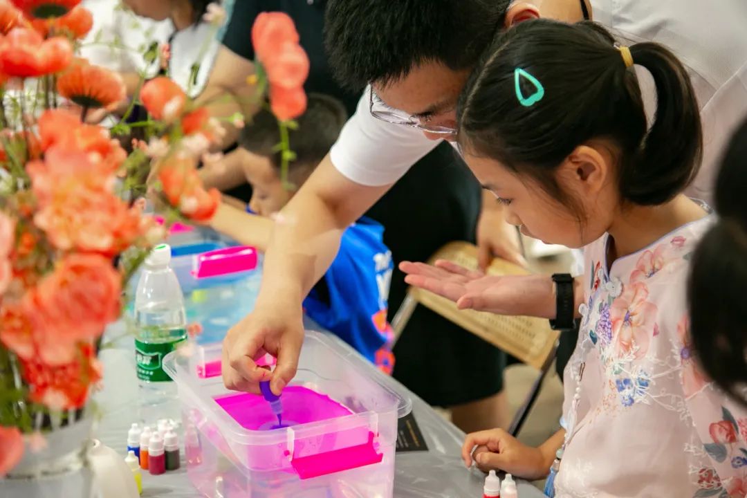 活動(dòng)現(xiàn)場(chǎng),志愿者向大家介紹水拓畫和水拓花瓶的知識(shí)并進(jìn)行演示制作,30組家庭在志愿者的指導(dǎo)下動(dòng)手制作,倒水、挑色、作畫、覆瓶,在輕松歡樂的氛圍中,一幅幅色彩斑斕的水拓畫浮于水面,一只只獨(dú)一無二的水拓花瓶立于臺(tái)上。孩子們?cè)诨顒?dòng)中學(xué)習(xí)并感受水拓技術(shù)的魅力,進(jìn)一步激發(fā)了創(chuàng)造力和想象力,也促進(jìn)了親子間的互動(dòng)與協(xié)作,讓成長(zhǎng)更有“溫度”。