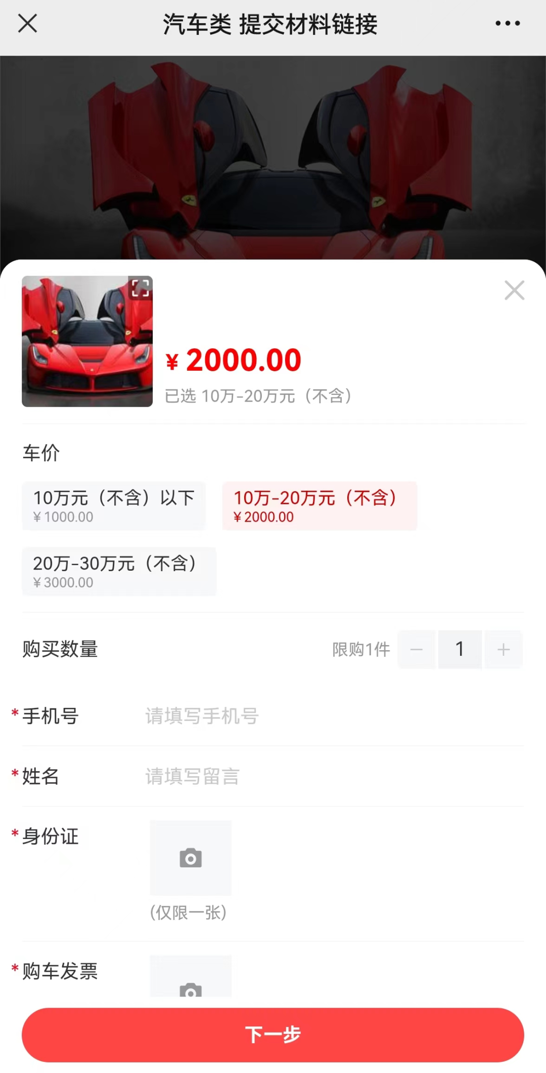 2、按照票面金額(不含稅價(jià))選取車(chē)價(jià)區(qū)間,填寫(xiě)手機(jī)號(hào)碼、姓名,上傳身份證照片、購(gòu)車(chē)發(fā)票照片、車(chē)輛完稅證明照片、行駛證照片,點(diǎn)擊“下一步”。