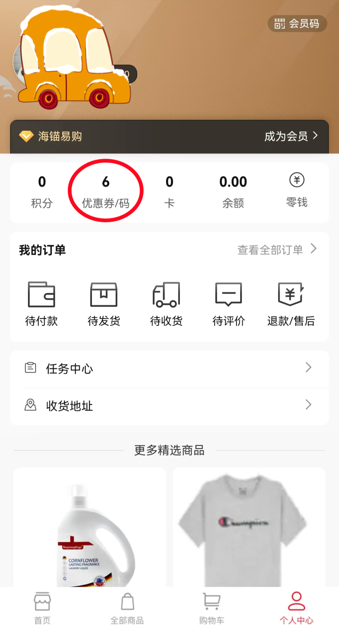 “個(gè)人中心”→“優(yōu)惠券/碼”查看