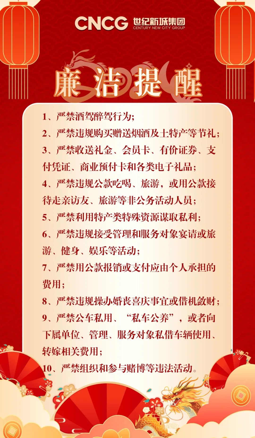 2024年元旦來臨之際,為持之以恒加固中央八項(xiàng)規(guī)定堤壩,堅(jiān)決防止“四風(fēng)”問題反彈回潮,世紀(jì)新城集團(tuán)紀(jì)委提醒全體干部職工:要堅(jiān)定理想信念,踐行初心使命,弘揚(yáng)清風(fēng)正氣,深刻把握不正之風(fēng)和腐敗互為表里、同根同源的關(guān)系,時(shí)刻緊繃廉潔自律之弦,筑牢廉潔思想防線,始終心懷戒懼、敬畏法紀(jì)、尚廉戒奢,廉潔過節(jié)、文明過節(jié)、節(jié)儉過節(jié),共同營造風(fēng)清氣正節(jié)日氛圍!