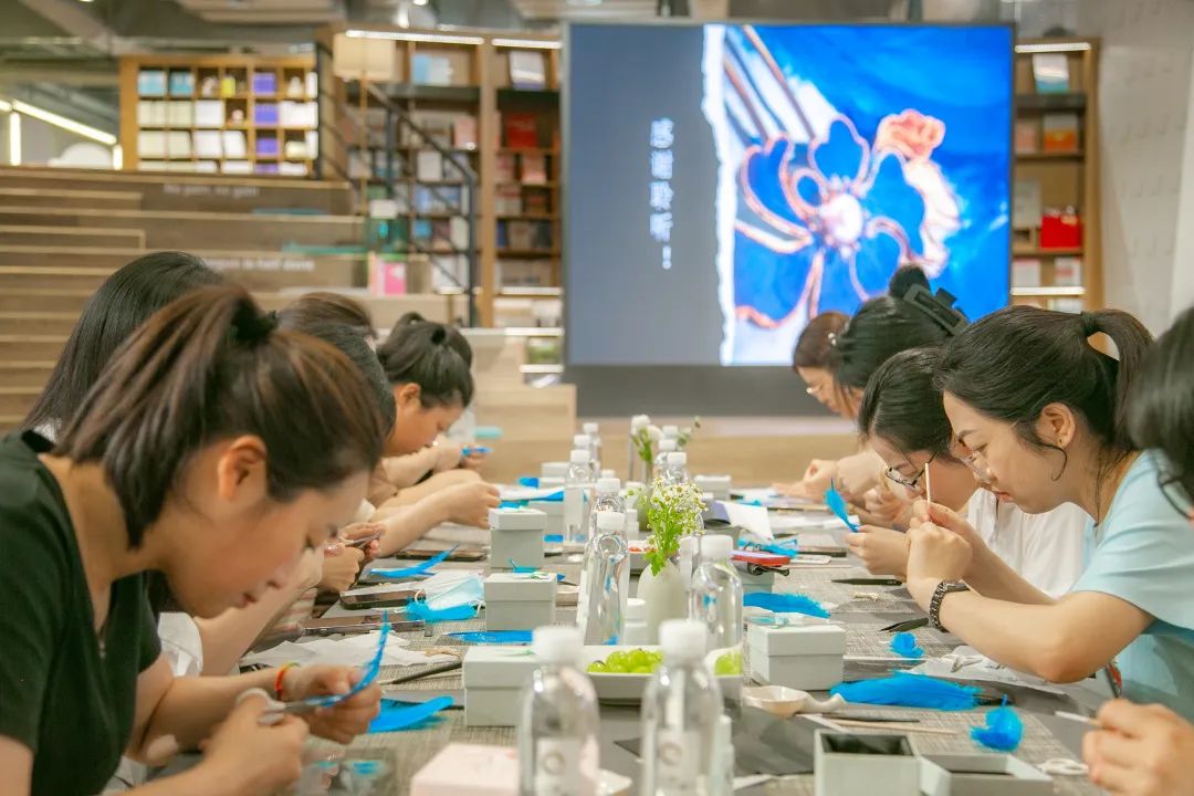 平穩(wěn)的案板,端方的紙筆,精細的工具,大家在歡聲笑語中,邊學邊做邊交流,描、剪、填、粘、鑲......每個步驟都大家全神貫注、小心翼翼、精益求精,好像一位位技藝嫻熟的工匠。不一會兒,巧手“工匠”們精心制作的點翠胸針就完成了,在紛繁復雜的工藝之下,一件件精美的作品宛若一只只翩然起舞的藍蝶、展翅欲飛的青鳥,凝結(jié)著大家勞動的愉悅和美的創(chuàng)造,大家在完成作品的同時,對傳統(tǒng)非遺文化點翠技藝也有了更深的感知。