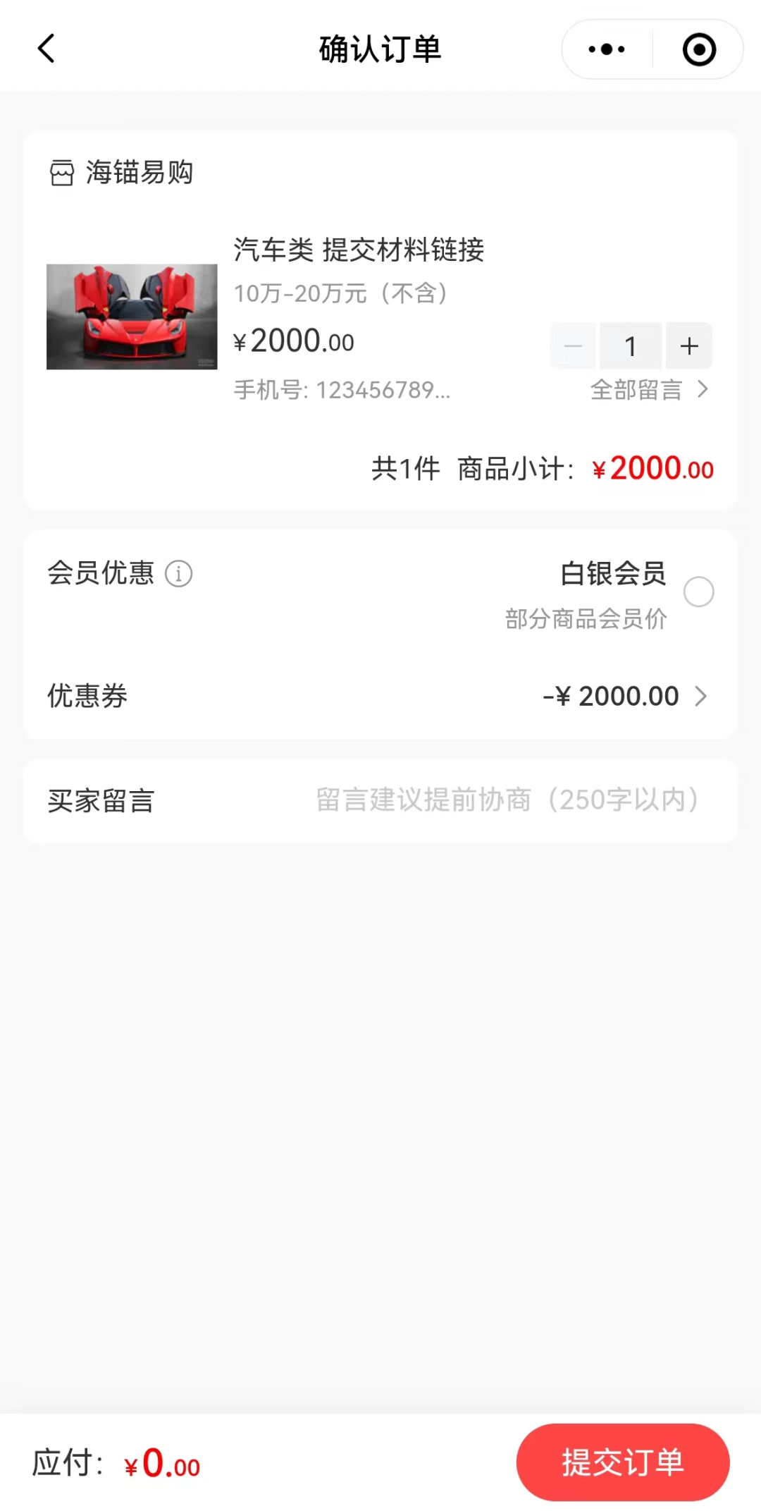例如,車價在10萬-20萬元(不含增值稅)的車輛,可抵扣2000元,如用戶已領(lǐng)取到2000元汽車現(xiàn)金抵用券,提交完材料后實際應(yīng)付金額應(yīng)為0元(如不為0元請勿提交訂單)。