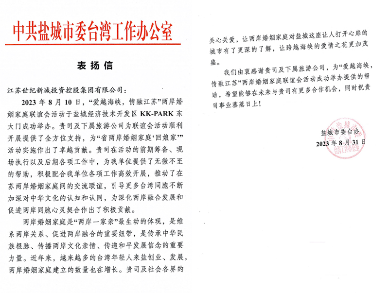 歡聚一堂,共敘情誼。8月10日,“愛越海峽 情融江蘇”兩岸婚姻家庭江蘇行暨第二屆全省兩岸婚姻家庭交流聯(lián)誼活動在鹽城經(jīng)開區(qū)KK-PARK國際街區(qū)圓滿落幕,讓百余位兩岸婚姻家庭成員看到了鹽城的熱情和活力。近日,集團收到來自中共鹽城市委臺灣工作辦公室的感謝信,對活動籌備支持和圓滿舉辦表示感謝。走進KK-PARK國際街區(qū),燈光隨著音樂跳躍、閃耀的福星現(xiàn)場、充滿煙火氣息的東市市集、浪漫旋轉的摩天輪......近年來,世紀新城集團在區(qū)黨工委、管委會的正確領導下,勇挑韓風國際文化名城建設主力軍重擔,文旅融合展現(xiàn)蓬勃活力,走出一條獨特的文旅融合新道路。