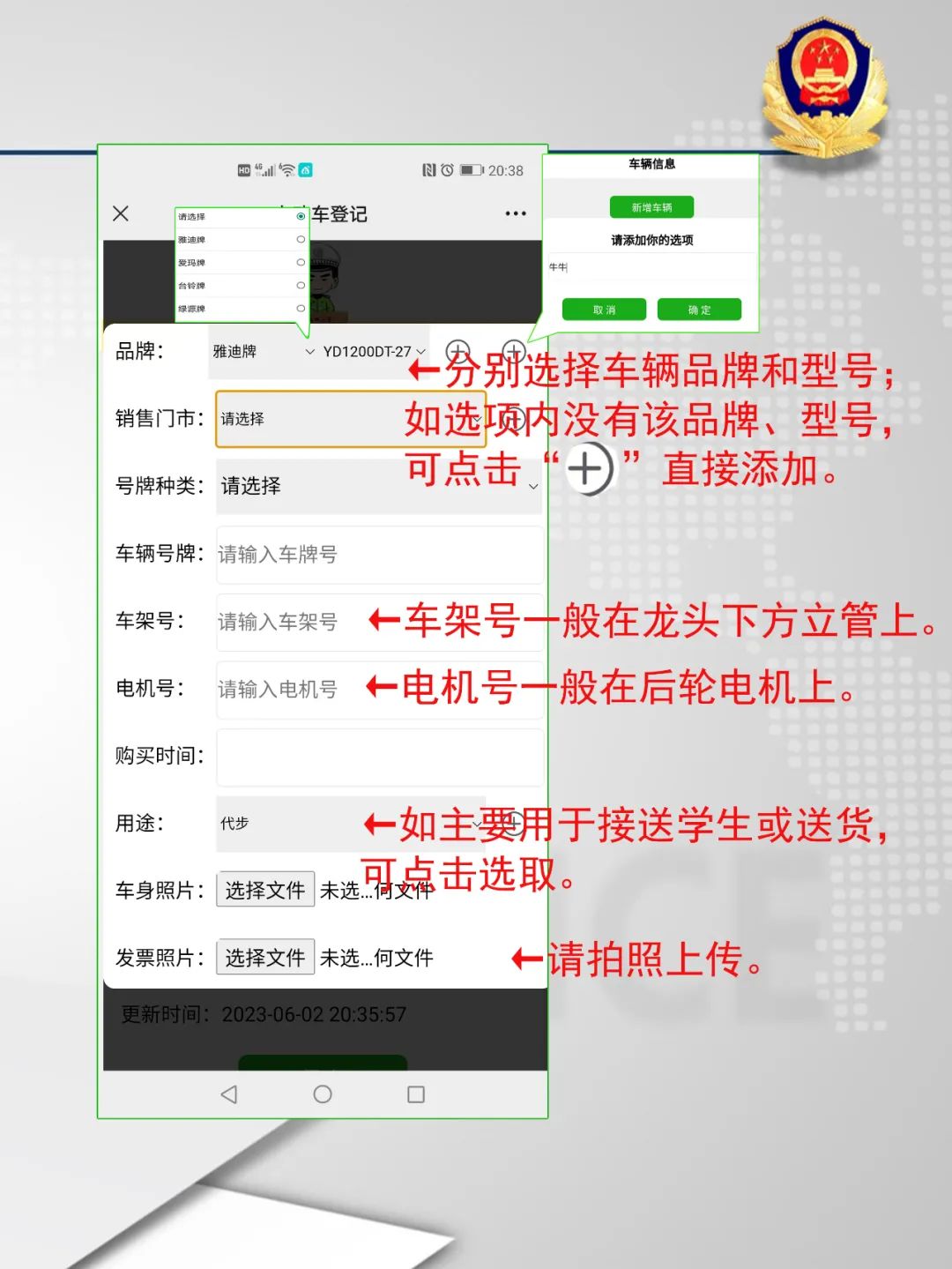 第3步:按照要求,填寫車輛品牌和型號;選擇“銷售門市、號牌種類”,輸入車輛號牌、車架號、電機(jī)號,以及購買時(shí)間、用途,最后選擇上傳車身照片以及購車發(fā)票。