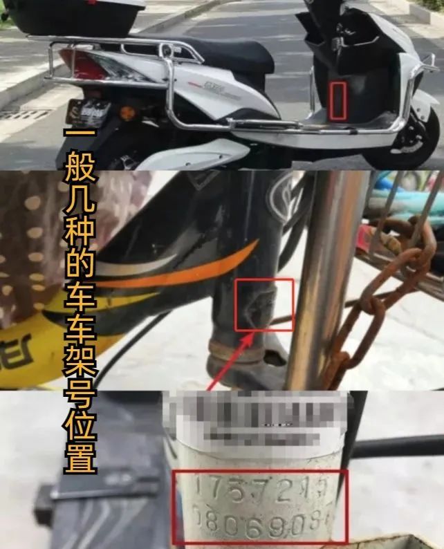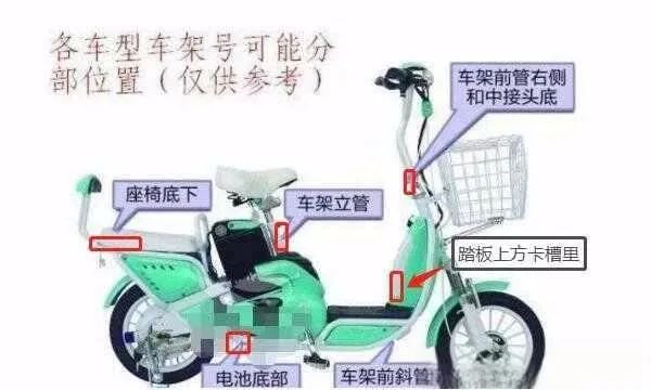 電動(dòng)車的車架號根據(jù)車型不同,車架號鋼印或標(biāo)貼的位置也不一樣,一般常見在踏板的上面,鑰匙孔的下面,有的在車架前管右側(cè)和中接頭底處,也有的在座椅底下,還有的在電池底部。