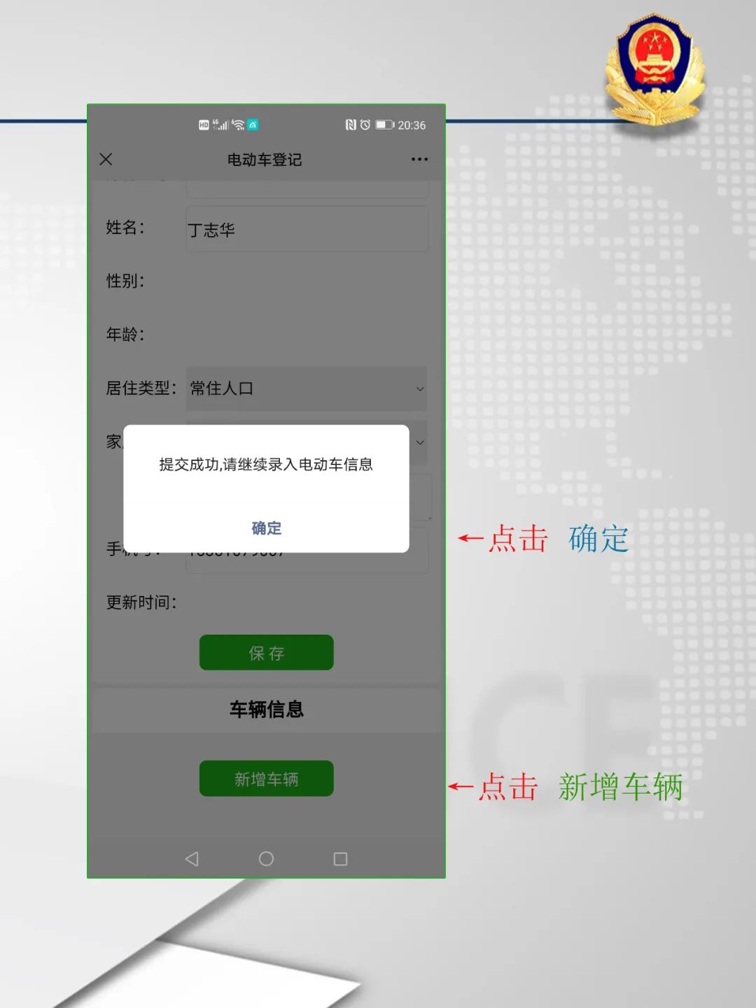 第2步:按照提示內(nèi)容填寫個(gè)人信息并保存后,點(diǎn)擊“確定”按鈕,再選擇點(diǎn)擊“新增車輛”按鈕。