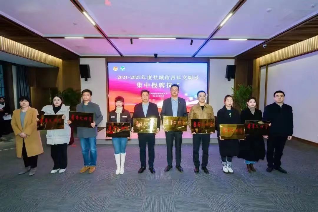 (圖為2021-2022年度鹽城市“青年文明號(hào)”集中授牌儀式,右五為地產(chǎn)公司工程部)