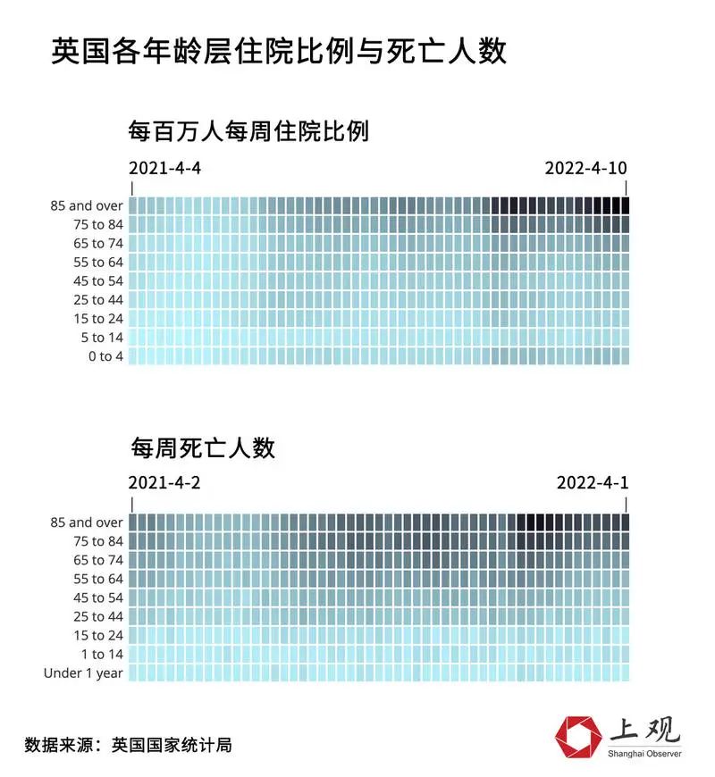 在英國(guó),老年群體的新冠住院率與死亡率一直都是最高的,并遠(yuǎn)超其他年齡段。