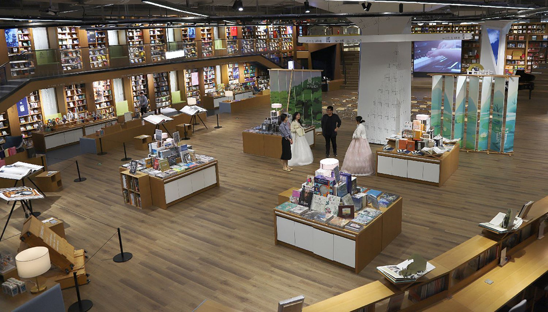 客廳以促進(jìn)中韓文化交流為導(dǎo)向,引入優(yōu)秀文化藝術(shù)資源的同時(shí),不斷發(fā)酵本土文化元素,致力形成獨(dú)具特色的城市文化印象點(diǎn)。店內(nèi)藏書約40種共約15萬冊(cè),以文學(xué)、藝術(shù)、人文社科以及少兒圖書為主,融合文創(chuàng)、咖啡、輕食、生活、休閑于一體,風(fēng)格各不相同,活動(dòng)空間充裕。一層復(fù)合式圖書綜合館約5400平方米,分為城市書房、階梯書墻、閱讀新知、藝術(shù)書區(qū)、中心活動(dòng)區(qū)、紅色書區(qū)、外國(guó)專家書屋、創(chuàng)意文具區(qū)、韓國(guó)生活市集、咖啡區(qū)、親子空間、親子餐廳、秘密花園等14個(gè)功能區(qū)域。5.6米巨幕書墻讓讀者置身于鱗次櫛比的書架間,徜徉于知識(shí)海洋。紅色書區(qū)以紅色文化為主線,開設(shè)習(xí)近平新時(shí)代中國(guó)特色社會(huì)主義思想專題展柜。藝術(shù)書區(qū)匯集國(guó)內(nèi)外150多家出版社、藝術(shù)機(jī)構(gòu)出版品,展陳藝術(shù)裝置“永不落幕的展覽”大書展。中心書區(qū)創(chuàng)新“閱讀+體驗(yàn)”運(yùn)營(yíng)模式,集合自助閱讀、交流分享、文化活動(dòng)等多種功能。除一層精品圖書外,二層藝術(shù)空間、三層主題餐廳還提供文創(chuàng)產(chǎn)品、親子閱讀、輕食餐飲等生活體驗(yàn),讓閱讀空間的內(nèi)涵更加多元化。