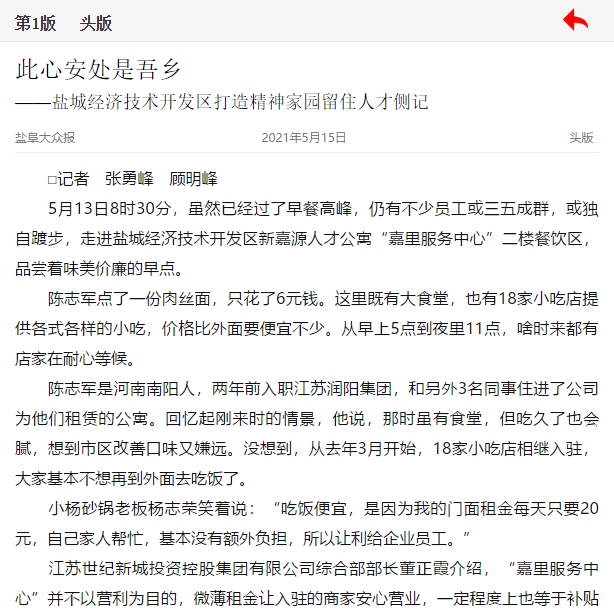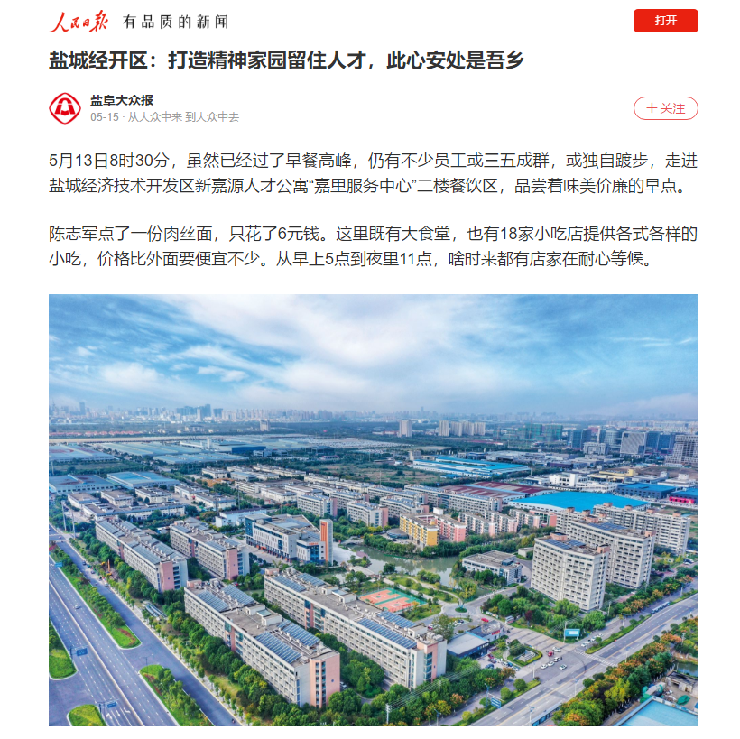 近日,人民日?qǐng)?bào)、《學(xué)習(xí)強(qiáng)國(guó)》客戶端江蘇學(xué)習(xí)平臺(tái)、鹽阜大眾報(bào)等多家媒體以“此處安心是吾家”為題,集中宣傳集團(tuán)新嘉源人才公寓,打造精神家園留住人才。